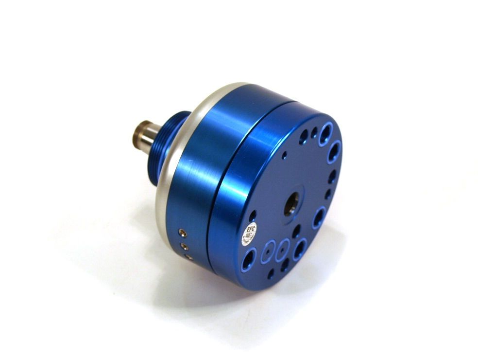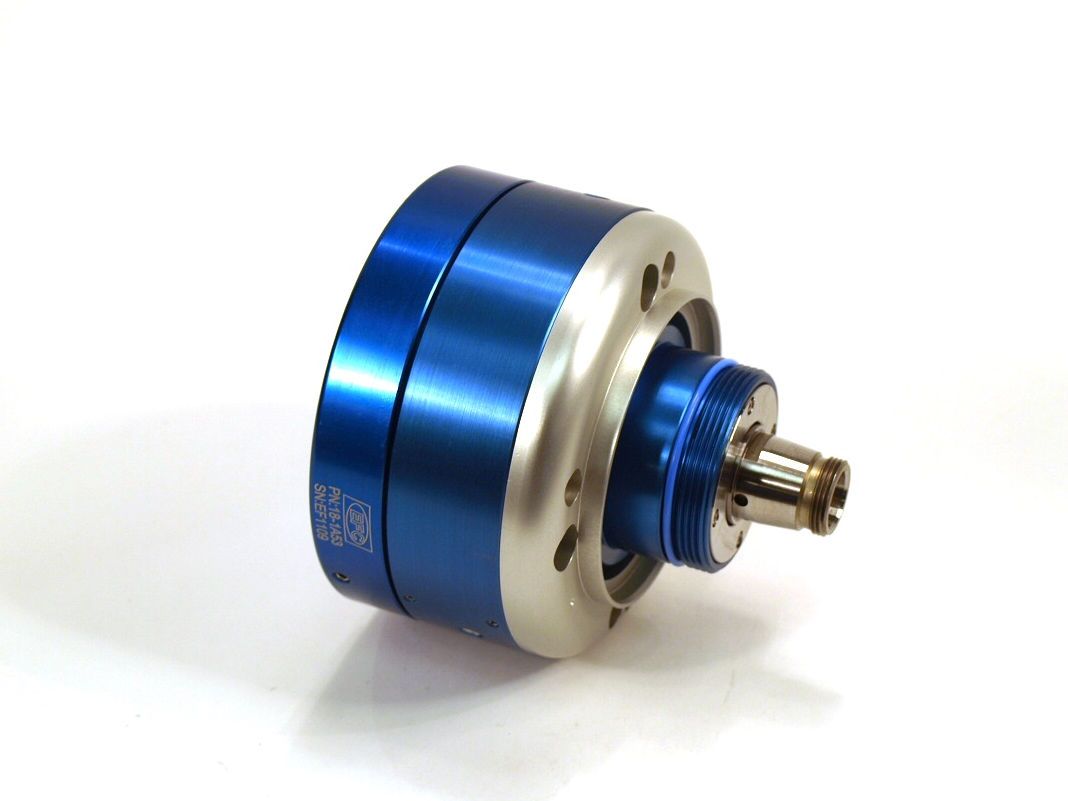 The motor is of the orifice bearing type that allows the shaft/flywheel assembly to “float” frictionless on a thin film of air. Drive air (DA), brake air (BR), turbine exhaust (EX) as well as the bearing air (BE) are supplied to the motor assembly via the back plate.